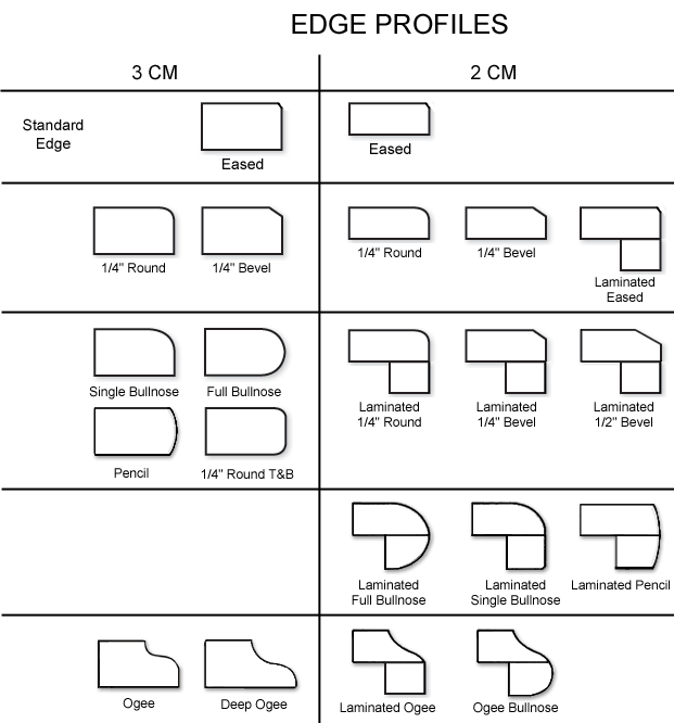 There are many different edge details that can be done with stone. Below are examples of the most common edges. Please note that these options can vary depending upon the natural stone you are using.